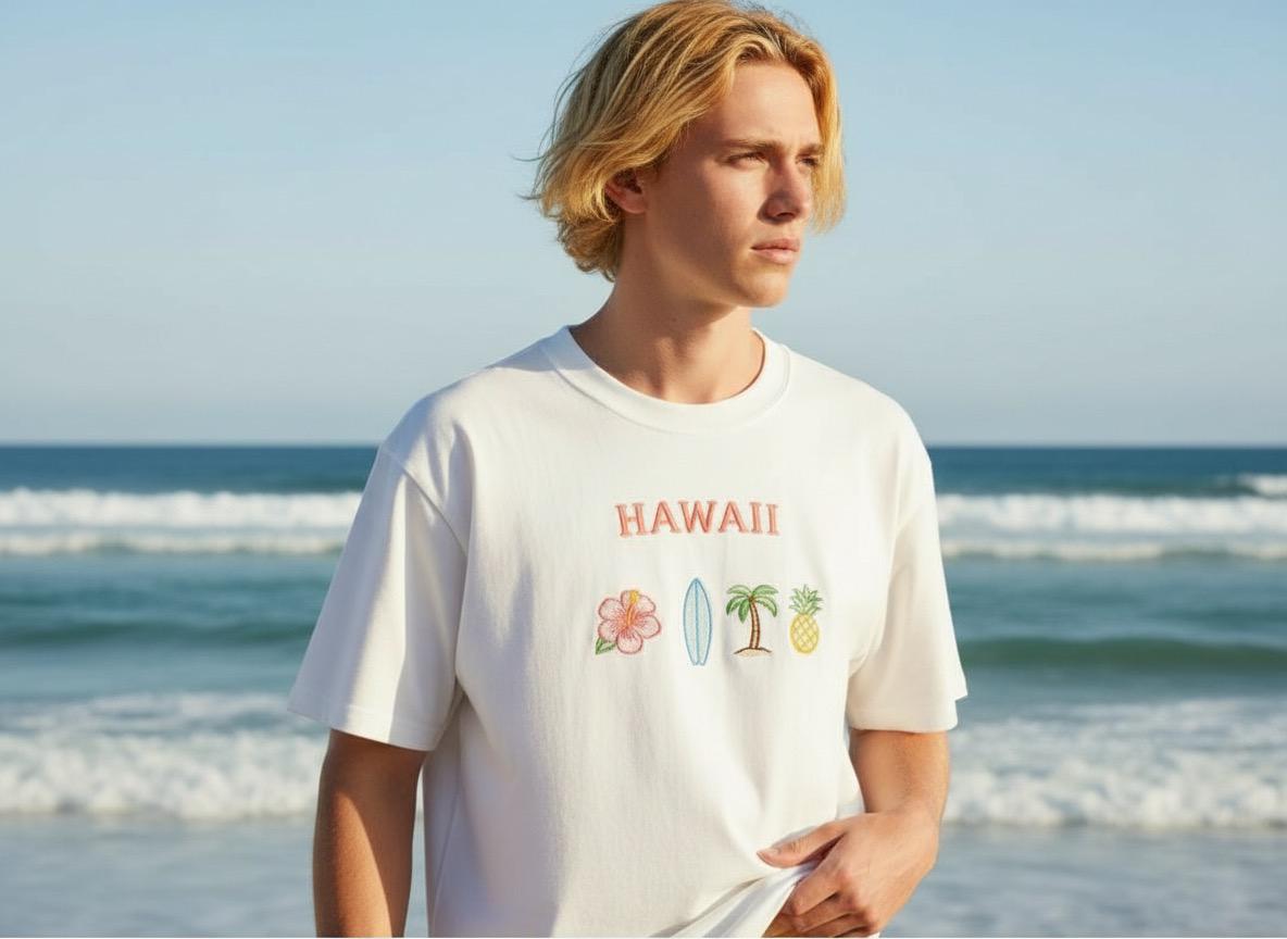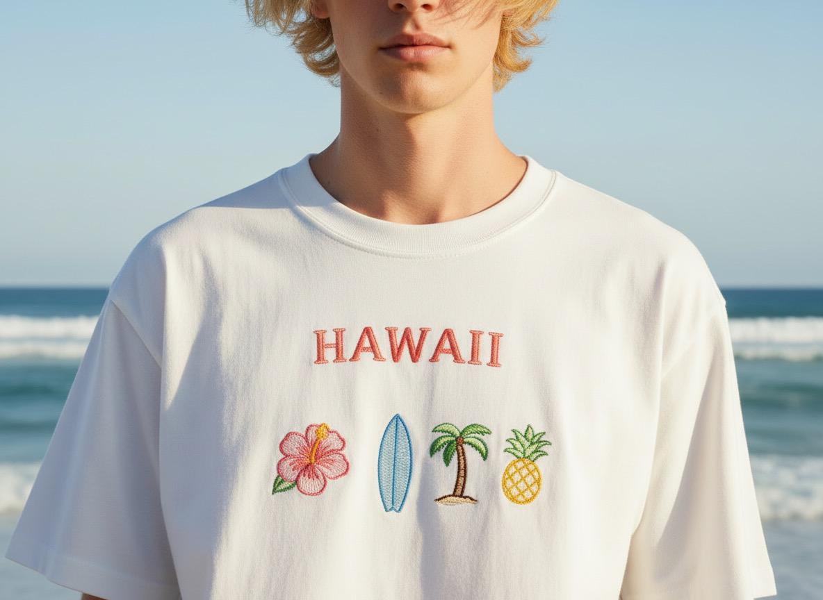 Bring island vibes to your everyday look with this premium embroidered Hawaii tee. Featuring bold satin-stitched “HAWAII” lettering above four vibrant embroidered icons — a hibiscus flower, surfboard, palm tree, and pineapple — this design captures the spirit of tropical beach life.