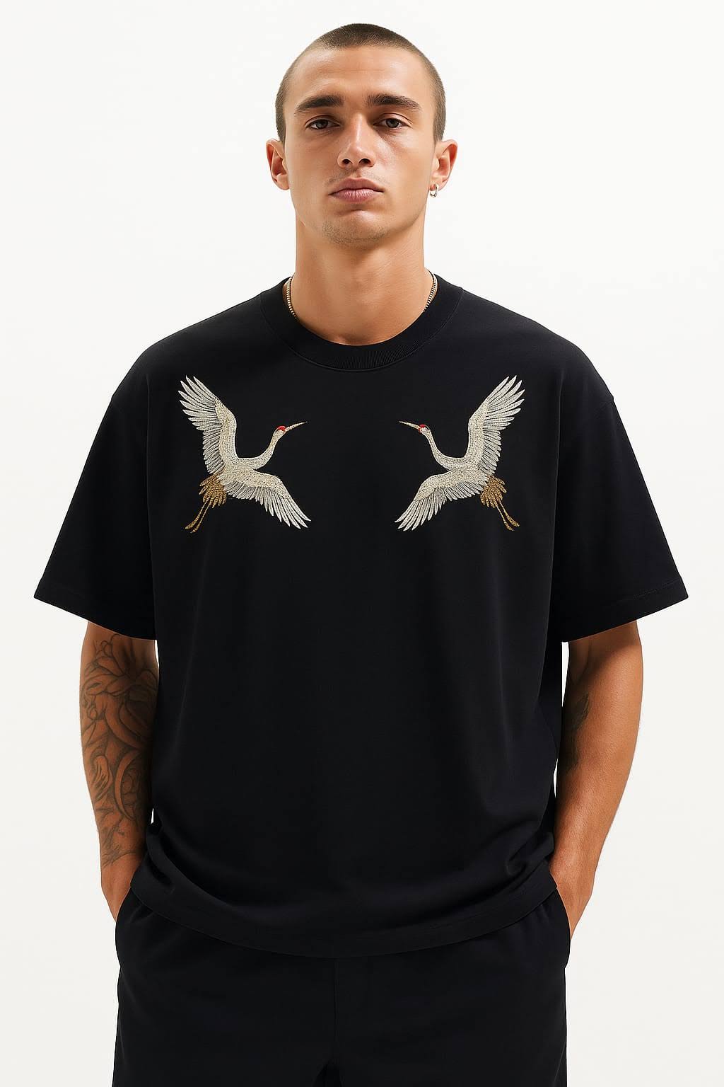 More than just clothing, it’s a symbol of good fortune. Introducing the pinnacle of elevated streetwear: our men’s embroidered oversized t-shirt. This masterpiece of design and premium comfort, built for the modern Indian man, features a stunning, symmetrical embroidery of two Japanese cranes (Tsuru), timeless symbols of longevity, luck, and peace.