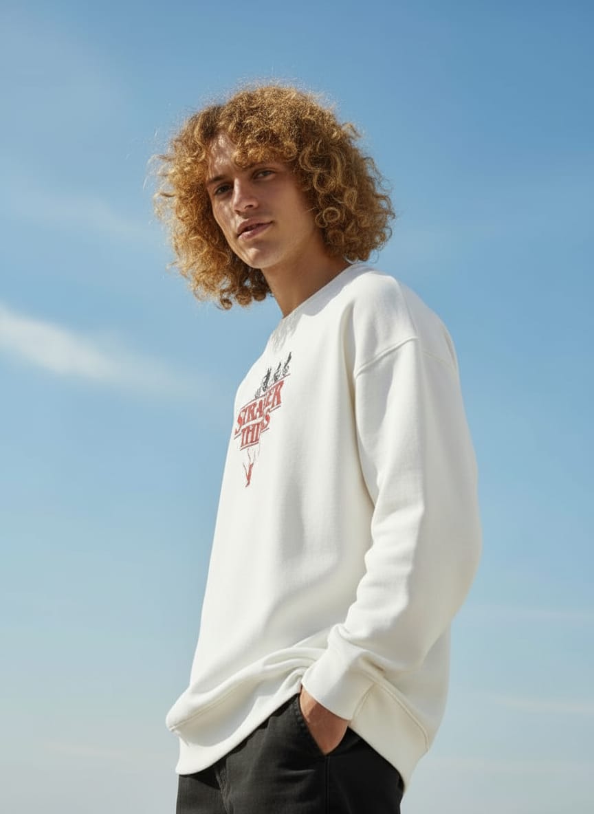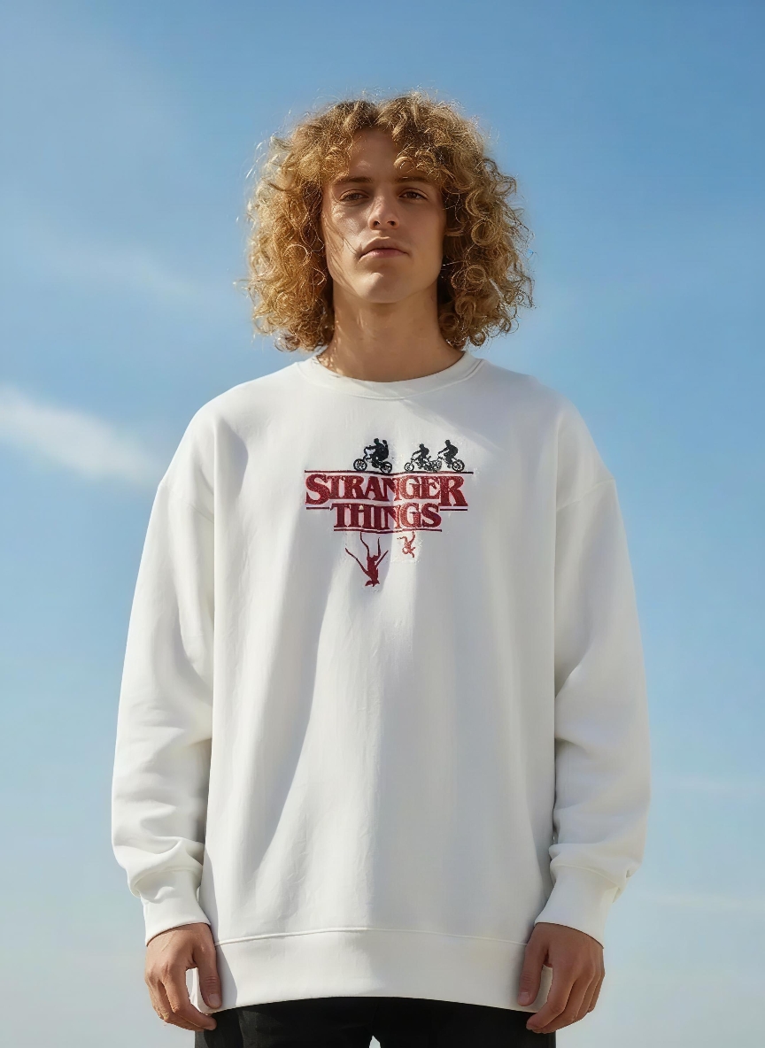 Enter the Upside Down in Style. As the October breeze signals the start of the cozy season, it’s time to move beyond basic layers. Our Stranger Things inspired men’s embroidered sweatshirt is designed for the modern fan who values quiet confidence and artisanal detail. This is not just a basic top; it is a heavyweight oversized sweatshirt men essential that provides a crisp, structured silhouette perfect for the shifting season.