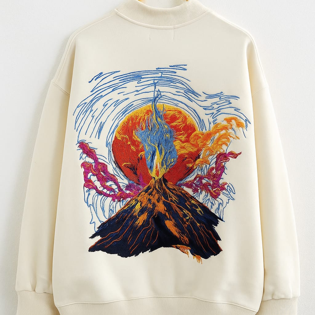 - Expressive & Artistic Embroidery: This volcano embroidered sweatshirt showcases a complex, multi-layered embroidery with a free-flowing, sketch-like quality that mimics a painter’s brushstrokes.