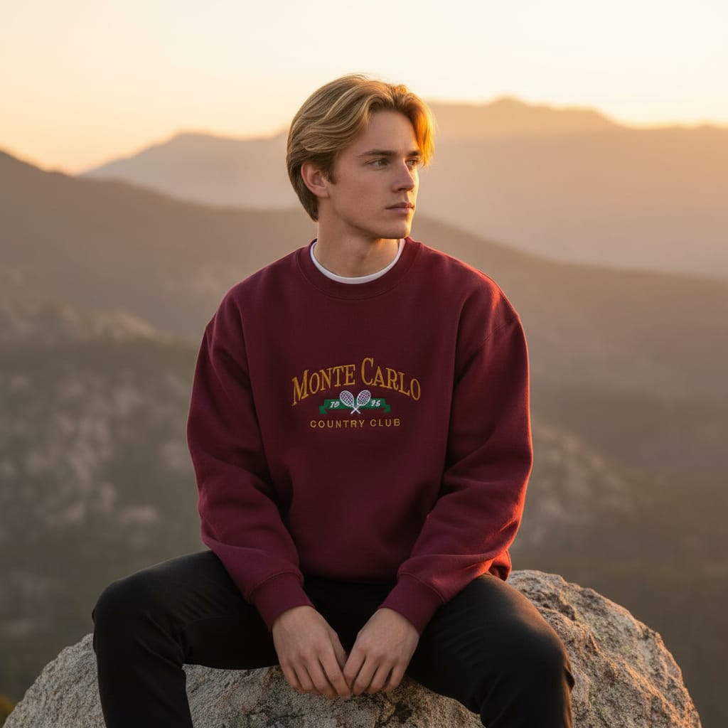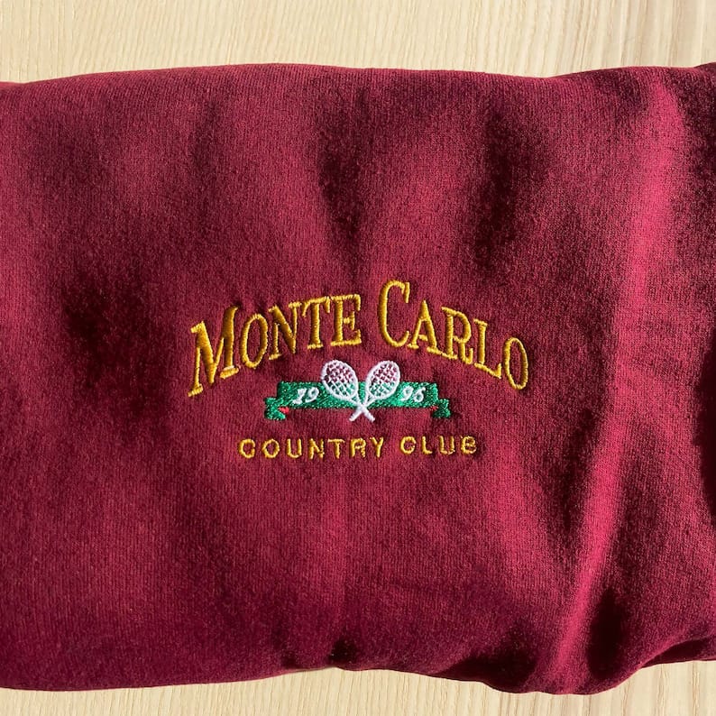Inspired by classic European country club aesthetics, this Monte Carlo embroidered sweatshirt blends vintage elegance with modern comfort. Featuring finely detailed machine embroidery with premium threadwork, the design showcases iconic typography paired with a refined tennis motif.