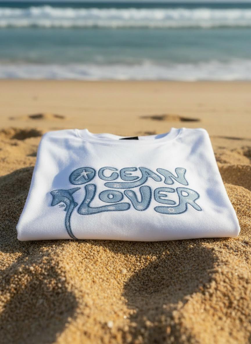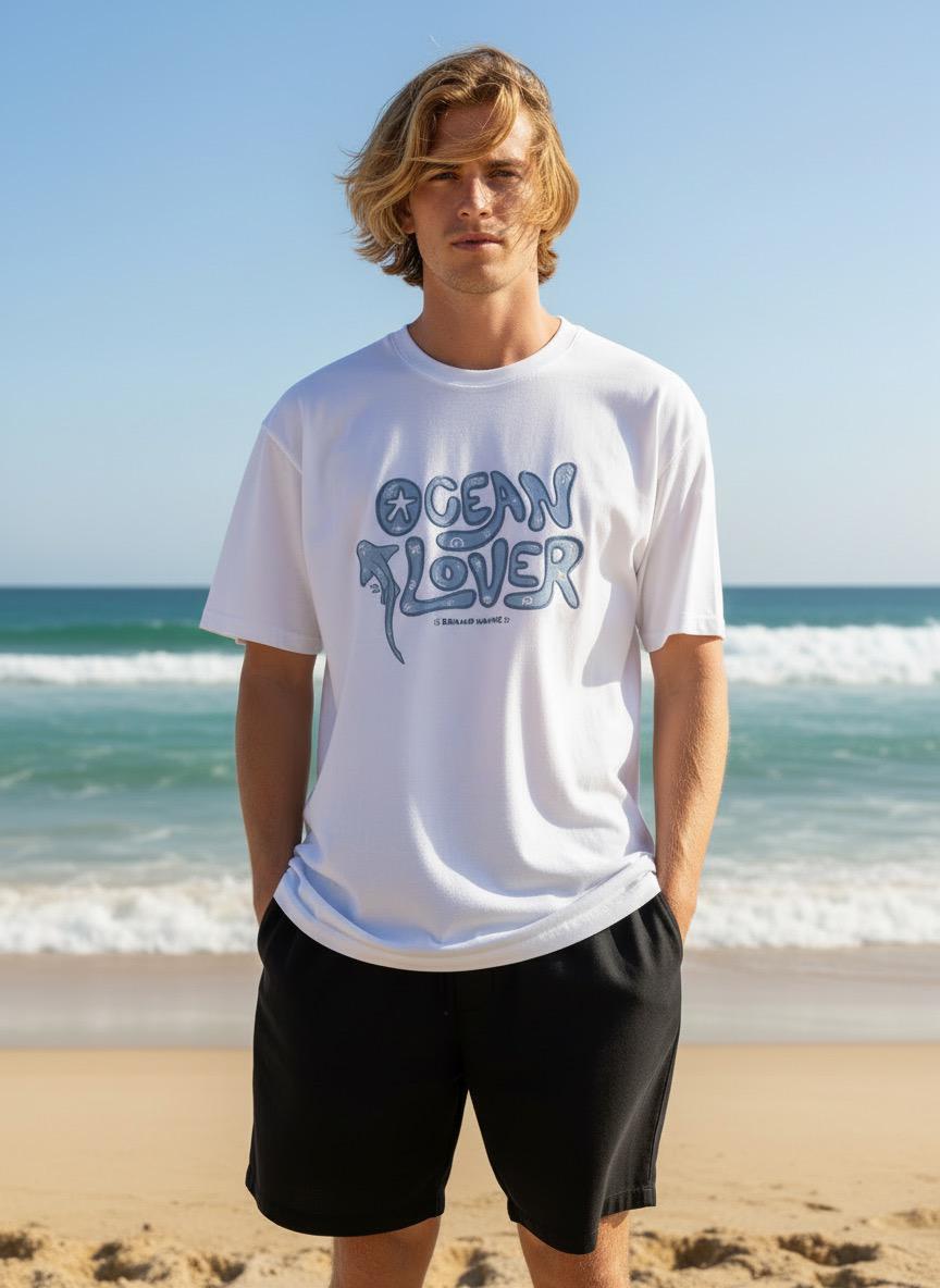 Show your connection to the sea with this bold Ocean Lover embroidered tee. Featuring wave-inspired lettering and a stylized manta ray graphic across the chest, the design captures coastal energy and marine adventure.