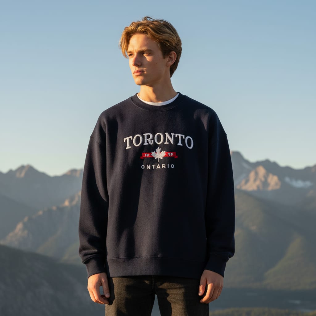 Inspired by classic North American collegiate style, this Toronto Ontario sweatshirt features premium machine embroidery with a bold yet timeless aesthetic. The design highlights clean typography paired with an iconic maple leaf emblem, symbolizing heritage, pride, and travel culture.