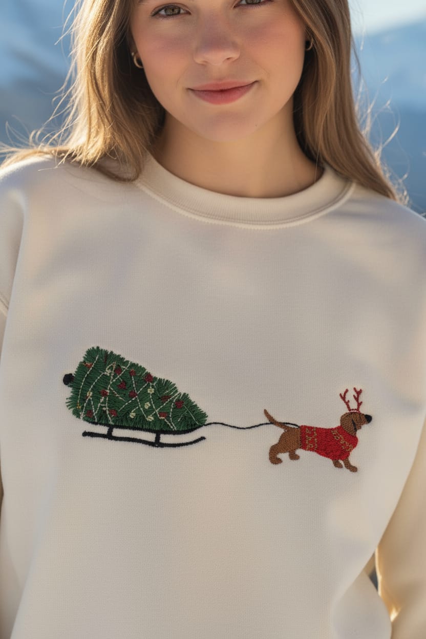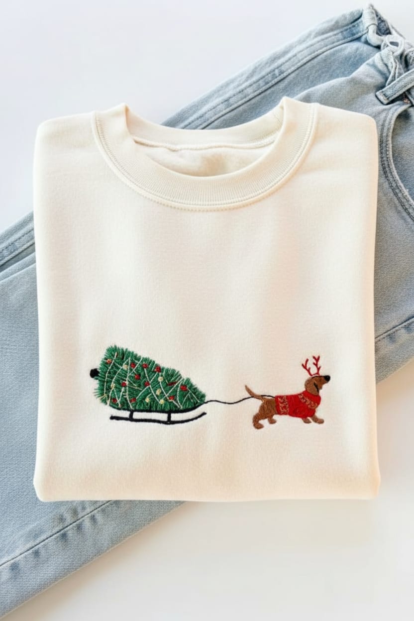 Artisanal Embroidery: A high-definition, multi-color embroidery of a dachshund in a reindeer sweater, adding a playful yet sophisticated touch to your outfit.